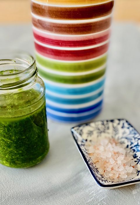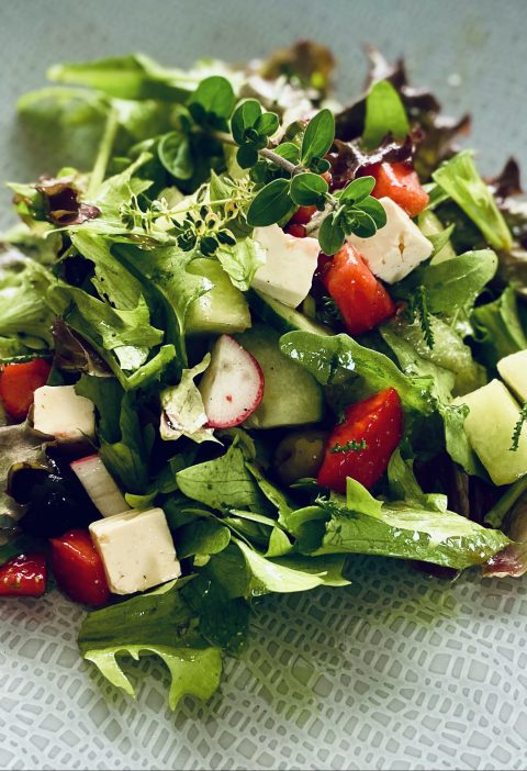 1 Bund Pflücksalat, alternativ gekaufter Salat 1 Bund Ruccola 1 Portion Früchte, hier wurden Erdbeeren und Honigmelone verwendet 1/4 Salatgurke 2 Radieschen eingelegter Feta und Oliven nach belieben 1 Frühlingszwiebel Dressing, 2 Löffel Olivenöl, 1 Löffel Mango Essig, Salatkräuter